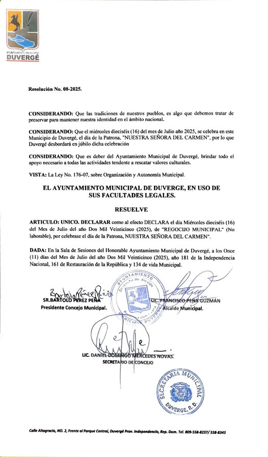 Alcaldía Municipal de Duvergé: RESOLUCION No. 08-2025. Donde este Ayuntamiento DECLARA el día Miercoles dieciséis (16) del mes de Julio del año Dos Mil veinticinco (2025), de «REGOCIJO MUNICIPAL» (no laborable), por celebrase el día de nuestra Patrona, «NUESTRA SENORA DEL CARMEN».