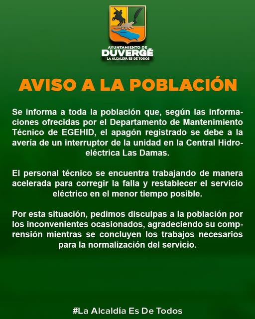 Se informa a toda la ciudadanía que, según las informaciones ofrecidas por el Departamento de Mantenimiento Técnico de la EGEHID, el apagón registrado se debe a una avería en un interruptor de la unidad de la Central Hidroeléctrica Las Damas.