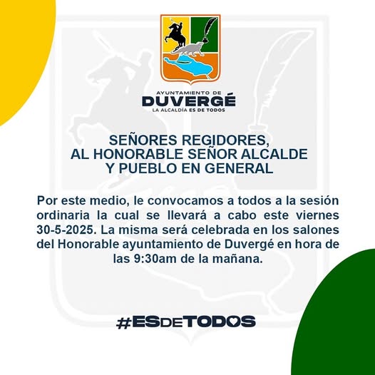 SEÑORES REGIDORES, AL HONORABLE SENOR ALCALDE Y PUEBLO EN GENERAL Por este medio, le convocamos a todos a la sesión ordinaria la cual se llevará a cabo este viernes 30-5-2025. La misma se celebrará en los salones del Honorable ayuntamiento de Duvergé en hora de las 9:30am de la mañana.