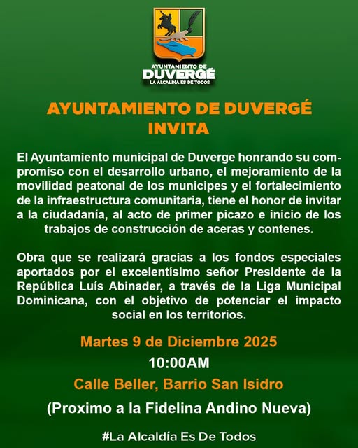 El Ayuntamiento Municipal de Duvergé, honrando su compromiso con el desarrollo urbano, el mejoramiento de la movilidad peatonal de los munícipes y el fortalecimiento de la infraestructura comunitaria, invita al pueblo en general a participar en el acto de primer picazo e inicio de los trabajos de construcción de aceras y contenes.