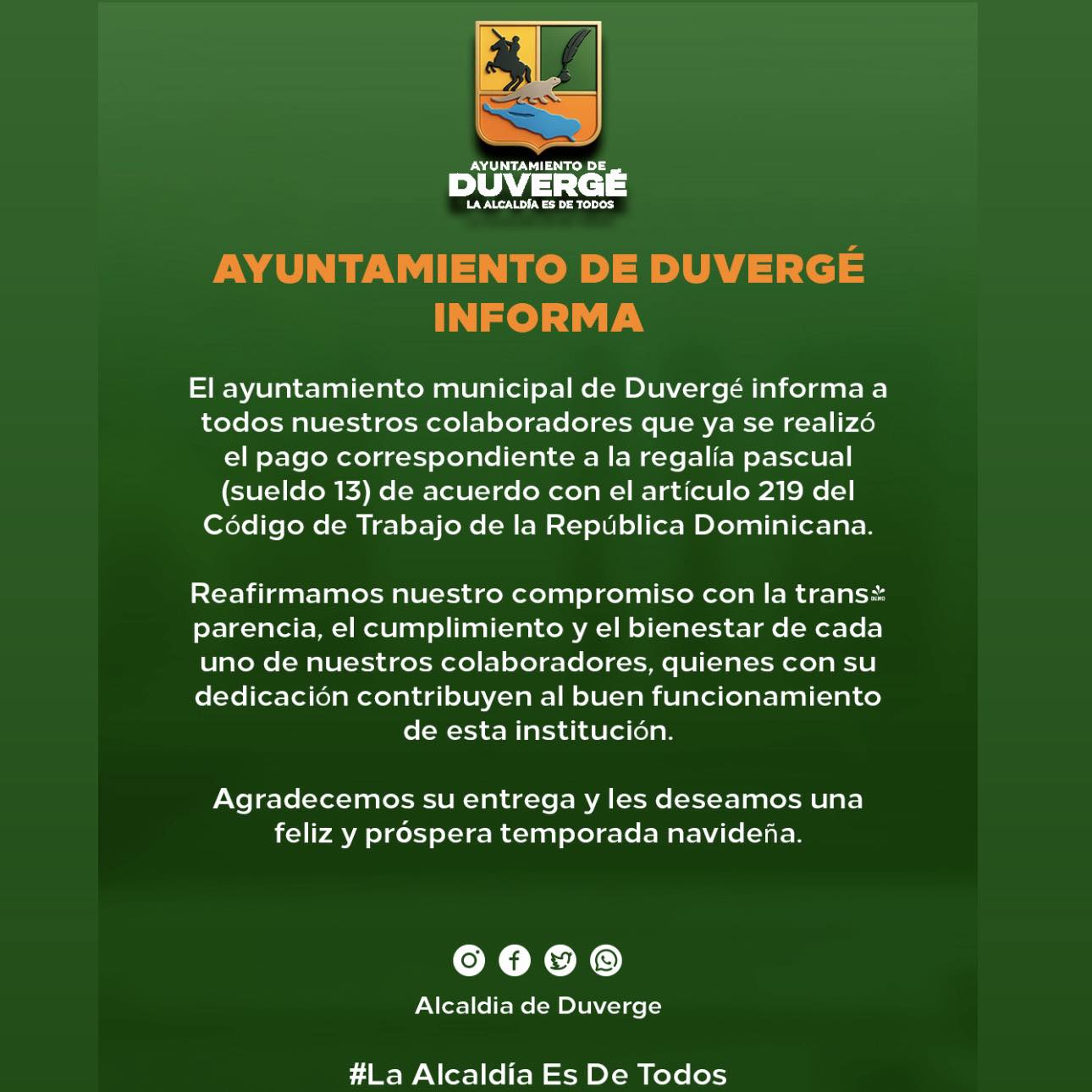 El ayuntamiento municipal de Duvergé informa a todos nuestros colaboradores que ya se realizó el pago correspondiente a la regalía pascual (sueldo 13) de acuerdo con el artículo 219 delCódigo de Trabajo de la República Dominicana.