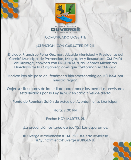 El Licdo. Francisco Peña Guzmán, Alcalde Municipal y Presidente del Comité Municipal de Prevención, Mitigación y Respuesta (CM-PMR) de Duvergè, convoca con URGENCIA a los Señores Miembros Directivos de las Organizaciones que conforman el CM-PMR.