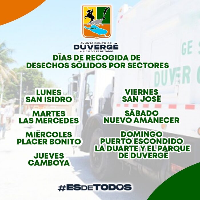 Queremos recordarles a todos nuestros habitantes cuales son los días de recogida de desechos por sectores, tuvimos un situación con varios de nuestros camiones sin embargo ya están funcionando con normalidad por lo que le pedimos que nos colaboren respetando los horarios establecidos.