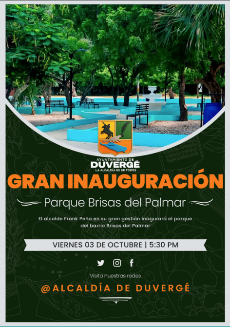 La Alcaldía de Duvergé tiene el placer de invitar a toda la comunidad a la Gran Inauguración del Nuevo Parque Brisas del Palmar!