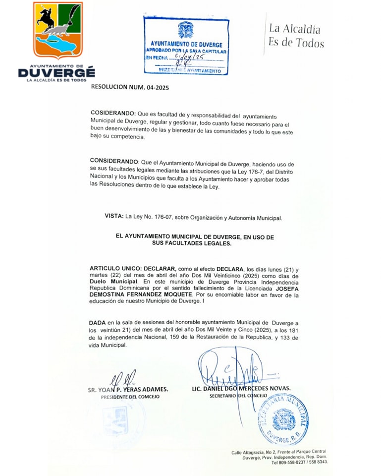 En reconocimiento a sus grandes aportes al desarrollo de la educación en nuestro pueblo y al legado imborrable que deja en Duvergé y en toda la región sur del país, se han declarado dos días de duelo municipal como muestra de respeto y gratitud.